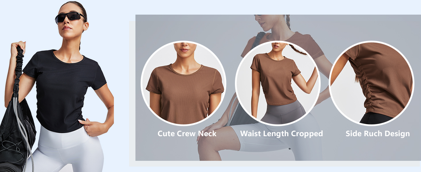 Athletic short sleeve crop tops designed with a round neckline flowing and elegant, simple and stylish. Ideal for yoga, fitness and casual wear.
