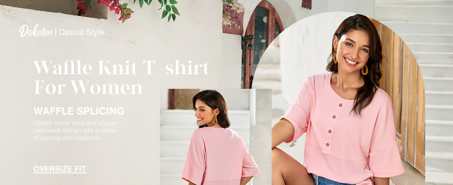 Dokotoo 3/4 Sleeve Casual Crew Neck Button Down Waffle Knit Tops