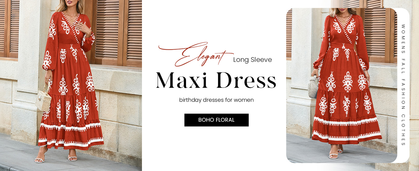 • PRETTYGARDEN Women's 2025 Fall Wedding Guest Dresses Boho Floral Long Sleeve V Neck Flowy Elegant Maxi Dress Beach Clothes