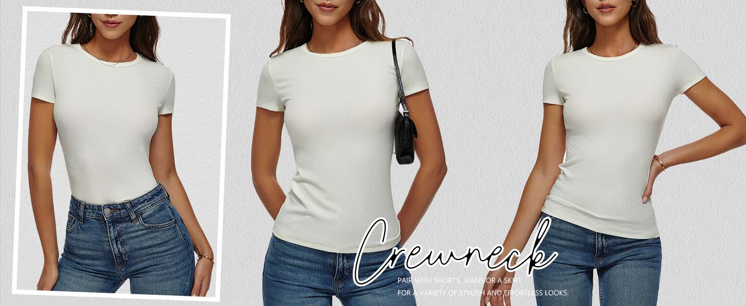 Women Short Sleeve Crewneck Ribbed Knit Slim Fitted Shirts