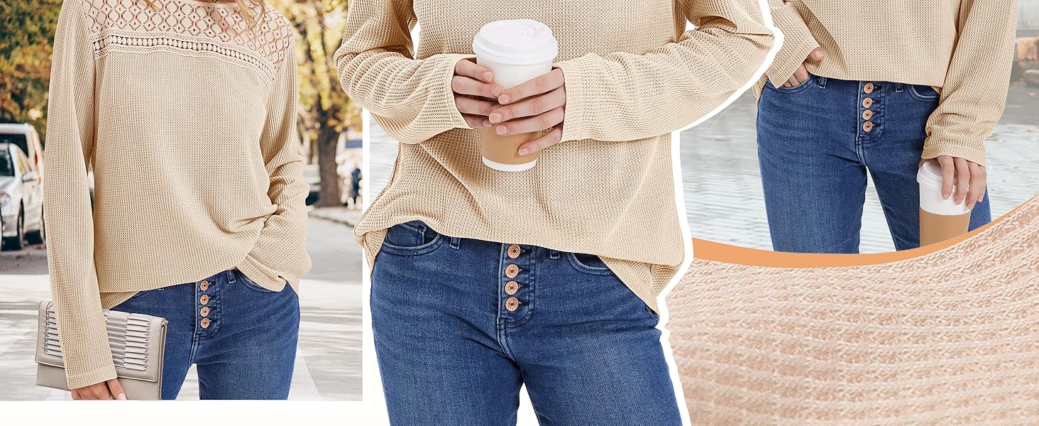 WIHOLL Women Blouses Long Sleeve Shirts Fall Fashion 2025 Lace Waffle Knit Tops